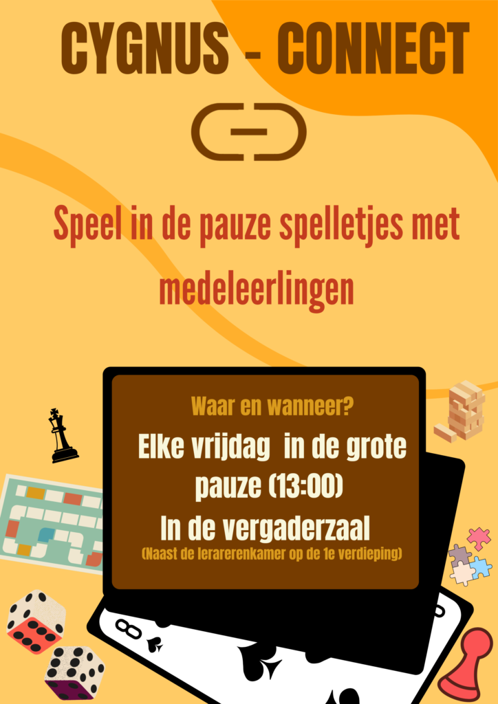 Cygnus connect is plek waar leerlingen die gezelschap zoeken van medeleerlingen terecht kunnen. Je kan gewoon binnenlopen wanneer je wilt. Binnen zijn er spelletjes en koekjes. Kom vooral een keer langs voor de gezelligheid!