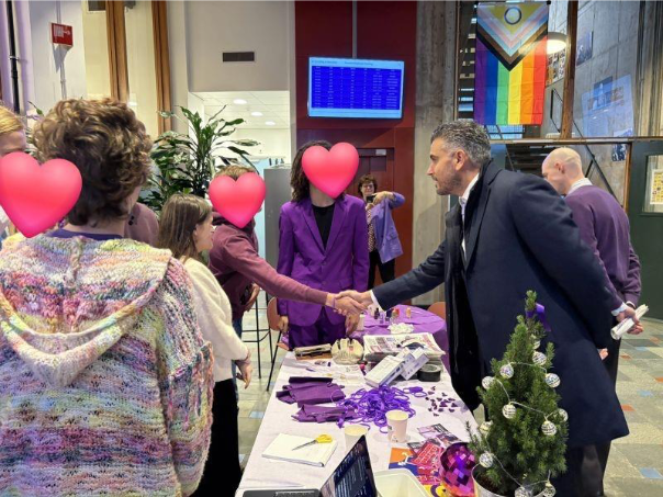 Vrijdag 12 december bracht wethouder Sofyan Mbarki een bezoek aan het Cygnus Gymnasium om te zien hoe deze dag, die in het teken staat van acceptatie en inclusiviteit, op school werd beleefd. Tijdens het bezoek ging de wethouder in gesprek met leerlingen van de GSA (Gender & Sexuality Alliance), docenten en de rector van de school. De leerlingen hadden de loge feestelijk omgetoverd tot een paarse ontmoetingsplek. De ruimte was volledig versierd en ingericht met verschillende tafels waar leerlingen en medewerkers met elkaar in gesprek konden gaan. Bezoekers konden vragen stellen, een Paarse krant meenemen, zich laten schminken of hun nagels paars laten lakken. Daarnaast werden paarse armbandjes uitgedeeld. De hele week waren er lessen gegeven over Paarse Vrijdag voor steun en solidariteit voor de Queer community. In een ontspannen sfeer nam wethouder Mbarki, onder het genot van thee of koffie en door hem meegebrachte gebakjes, uitgebreid de tijd om met leerlingen en docenten te spreken. In deze gesprekken werd stilgestaan bij wat Paarse Vrijdag betekent voor de schoolgemeenschap en hoe het Cygnus Gymnasium werkt aan een veilige en inclusieve omgeving voor iedereen. Het bezoek werd door alle betrokkenen als waardevol ervaren en onderstreepte het belang van dialoog tussen jongeren, onderwijs en het gemeentebestuur over thema’s als diversiteit, veiligheid en jezelf kunnen zijn. Diezelfde dag zijn ook de Raad van Toezicht leden en de bestuurders langs geweest bij de GSA leerlingen, omdat zij die dag een overleg hadden op het Cygnus gymnasium. #GSA #solidariteit #diversiteit #artikel1 #inclusiviteit