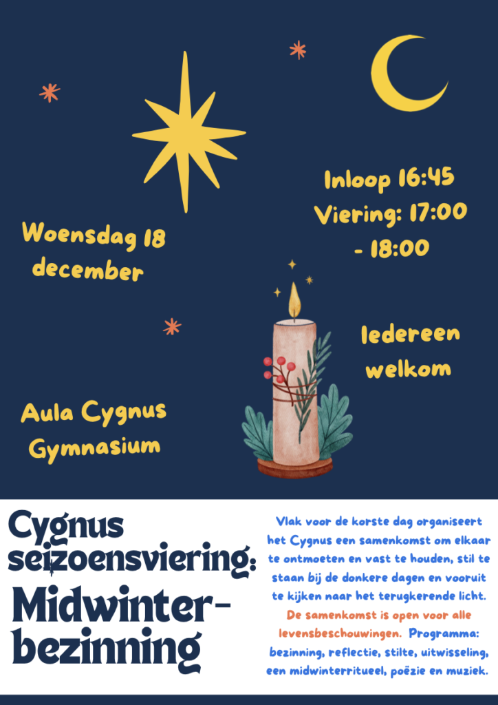In donkere dagen zoekt de Cygnusgemeenschap naar verbinding. Vlak voor de kortste dag van het jaar organiseert het Cygnus een samenkomst om elkaar te ontmoeten en vast te houden, stil te staan bij de donkere dagen en vooruit te kijken naar de terugkeer van het licht. Op het programma (onder voorbehoud): bezinning, reflectie, stilte, uitwisseling, een midwinterritueel, poëzie en muziek. De bezinning is voor leerlingen, collega’s en ouders en expliciet bedoeld voor alle gelovigen en nietgelovigen, en iedereen daartussenin. U bent van harte uitgenodigd om de bijeenkomst samen met uw kind bij te wonen. Inloop vanaf 16.45 uur, aanvang 17.00 uur. Pablo KamsteegOp school is het rustig. Onze leerlingen zijn nieuwsgierig, werken hard en laten zien hoe leuk leren kan zijn. Toch dringen de maatschappelijke en internationale ontwikkelingen onze school binnen, en dat maakt het soms complex. Het Cygnus is een diverse gemeenschap, met leerlingen uit alle windstreken en met uiteenlopende religieuze en culturele achtergronden. Zij moeten zich verhouden tot een wereld vol uitdagingen: de oorlogen in Oekraïne en Gaza, spanningen in Israël en op de Westoever, dreigingen vanuit Rusland, klimaatverandering, de impact van sociale media en de kansenongelijkheid die we in Amsterdam zo goed kennen. In 1970 schreef Basil Bernstein het artikel ‘Education cannot compensate for society’. Hij had een punt: een school kan niet alle maatschappelijke problemen oplossen. Toch zien we het Cygnus als een plek waar jonge mensen intellectueel én sociaal kunnen groeien, en waar zij ontdekken waar ze in het leven voor staan. Dit kan alleen in een veilige en voorspelbare omgeving, waarin ook ruimte is voor debat en gesprek. Om deze gesprekken te verdiepen, starten we een werkgroep rond het thema mensenrechten. Deze groep gaat de actuele ontwikkelingen bekijken vanuit een onderzoek matig en juridisch perspectief, maar ook persoonlijk: wat betekenen deze kwesties voor mij? Het doel is om onze leerlingen te ondersteunen in hun groei, zonder de kerntaak van de school uit het oog te verliezen. We blijven waken over een veilige omgeving, waarin iedere leerling zich gezien en comfortabel voelt. De wereldproblemen kunnen wij niet oplossen, maar we kunnen hier wél een gemeenschap vormen die samen sterk staat.