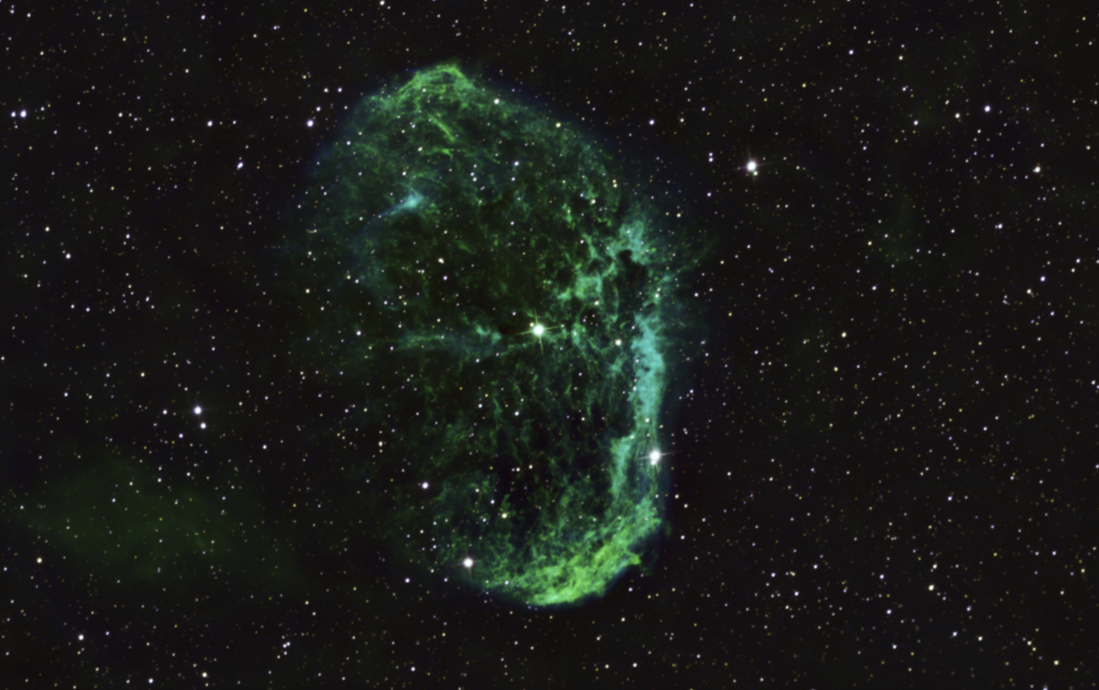 22 november 2025 is de eerste foto gemaakt met onze verfijnde telescoop. Deze nevel heet de Crescent Nebula in het Engels, of de Sikkelnevel/Halvemaannevel in het Nederlands, en hij ligt midden in het sterrenbeeld Cygnus.